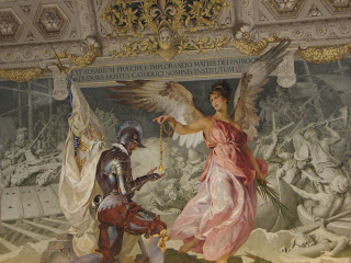 The Fire in the Borgo which is in the Room of the Fire in the Borgo (naturally), commemorates the miracle of 847 when Pope Leo IV made a sign of the cross and effectively extinguished a fire. I only took a photo of the detail in the foreground which shows Aeneas carrying his father on his back fleeing from Troy.